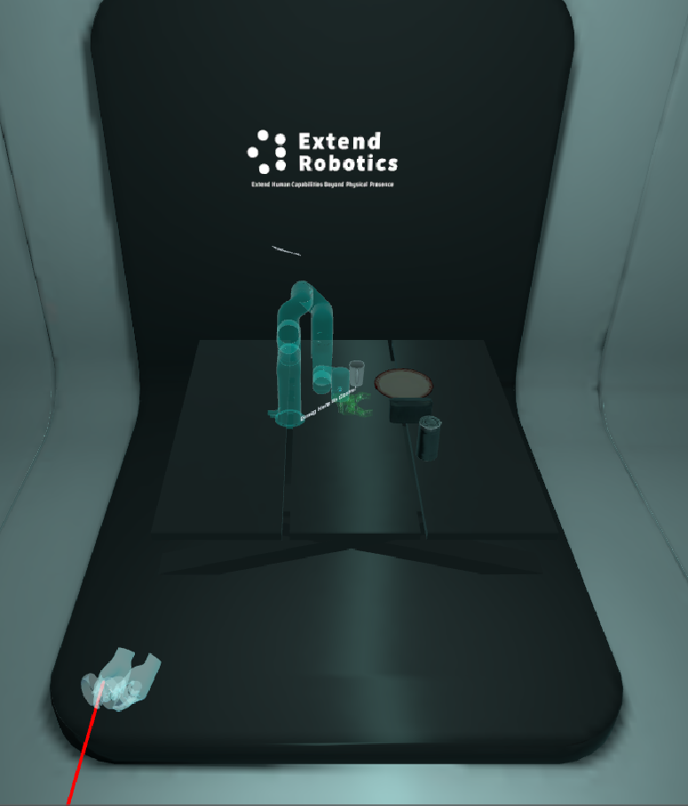 When the VR headset is not in use, the default camera position is in the middle of the room, overseeing the initial RoboKit position.