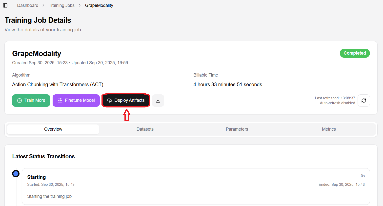 If you have registered a Cortex via the web console, simply click **Deploy Artifacts** to push the model. You must make sure the Cortex is in **connected** state and must be connected to internet.